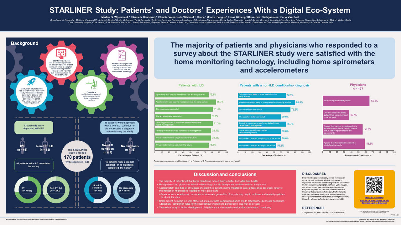 In the STARLINER study of disease behaviour in suspected ILD, the majority of patients and physicians were satisfied with the home monitoring technology, including home spirometers and accelerometers.